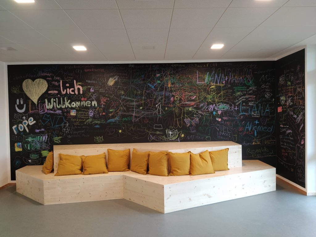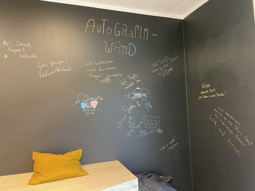 Da im Inneren das Arbeiten mit Spraydosen nicht gut ist, hat der JugendKlub Lincoln-Siedlung stattdessen eine Tafelwand. Diese wird während der Eröffnungsfeier als Autogrammwand genutzt. (Siehe Bilder weiter unten)