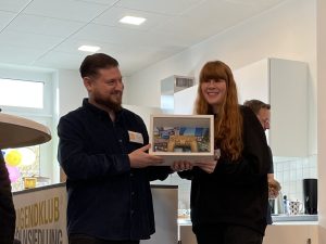 Carsten Nunold und Lisa Kunert vom Jugendtreff Lincoln erwähnen, dass es Spaß gemacht hat, die Jugendlichen in der Siedlung zusammen zu holen und gemeinsam mit ihnen einen Ort zum Treffen zu entwickeln. In den Containern an der Lincolnstraße wurde (und wird bis Ende diesen Jahres) gespielt, gechilled und geschwätzt. Die Außenwände wurden regelmäßig neu besprayed. Zur Staffelübergabe überreichten Sie dem Team vom neuen JugendKlub den goldenen Controller. In dem Schaukasten sind außerdem Bilder aus der Zeit des Jugendtreffs enthalten.