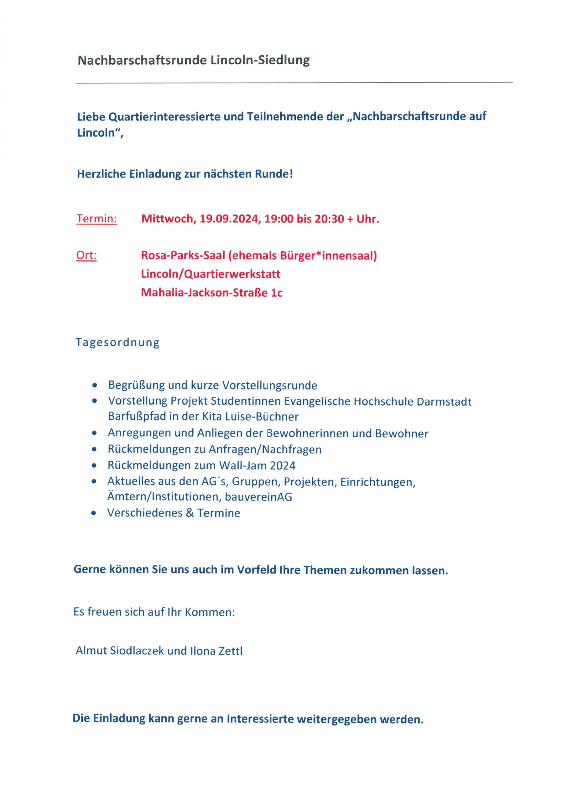 Alle Bewohnerinnen und Bewohner der Siedlung sind herzlich eingeladen zur Nachbarschaftsrunde am 19. September um 19 Uhr. Bei diesem Treffen im Bürger*innensaal (Mahalia-Jackson-Str. 1C) wird Aktuelles zur Lincoln-Siedlung vorgestellt und die Anliegen der Anwesenden besprochen. Alle Bewohner und Bewohnerinnen der Siedlung sind herzlich eingeladen.