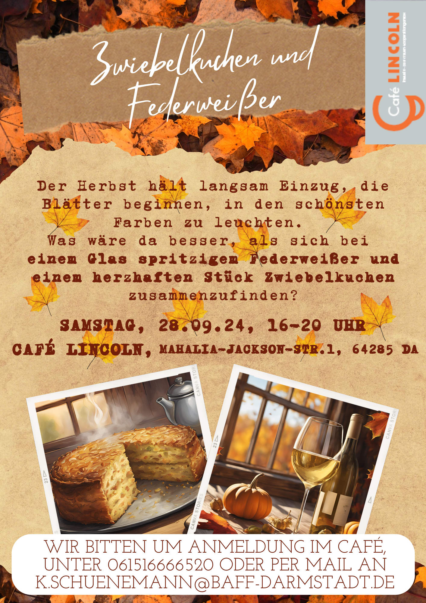 Anlässlich der Jahreszeit bietet das Café Lincoln zum Aktionssamstag am 28.09. herzhaften Zwiebelkuchen und spritzigen Federweißer an.