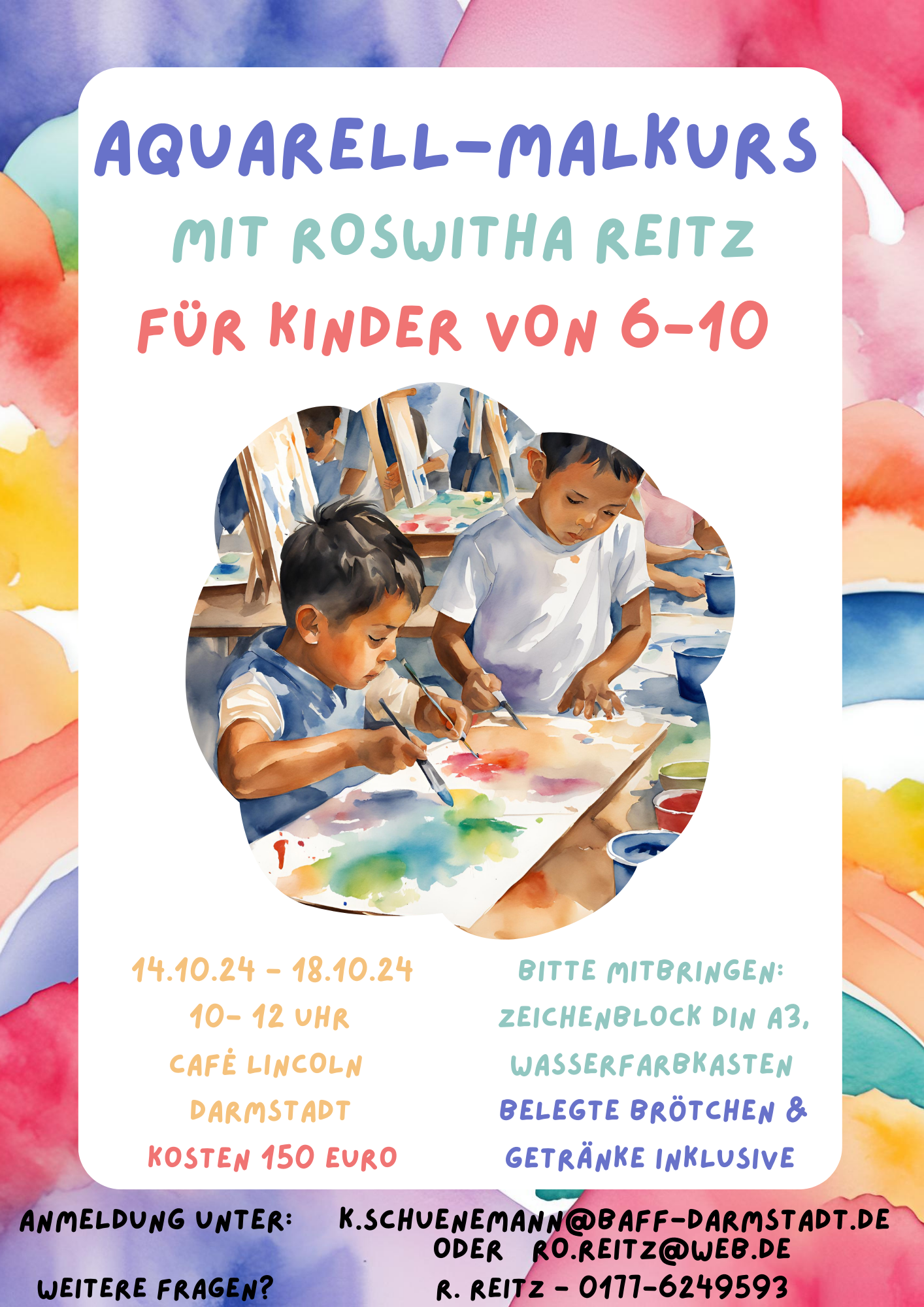 Wasserfarbkasten und Din-A3-Malblöcke bitte selbst mitbringen, Kittel und Pinsel sind ebenfalls empfohlen. Der Kurs kostet 150 Euro pro Kind.