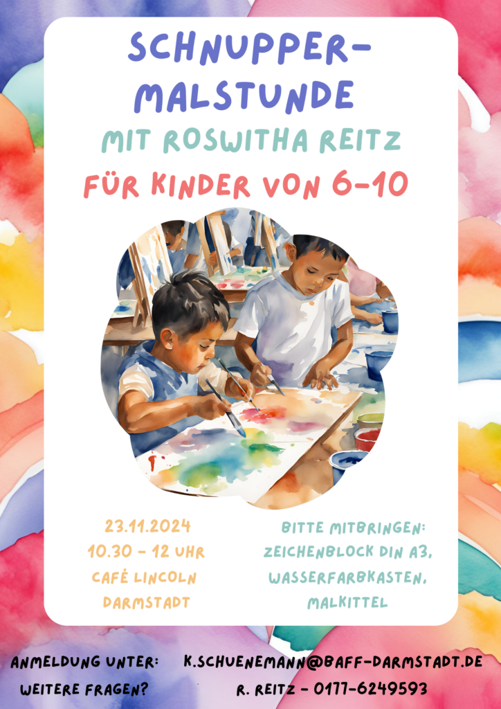 Am Samstag morgen, dem 23. November, von 10:30 bis 12 Uhr können sich junge Menschen zwischen 6 und 10 Jahren selbst künstlerisch betätigen. Im Café Lincoln bietet Roswitha Reitz eine Schnuppermalstunde an. Din-A3-Zeichenblöcke, Wassermalfarben und Kittel bitte selbst mitbringen. Um Anmeldung per E-Mail an k.schuenemann@baff-darmstadt.de wird gebeten. Bei Fragen steht Roswitha Reitz telefonisch unter 0177-624 95 93 zur Verfügung.