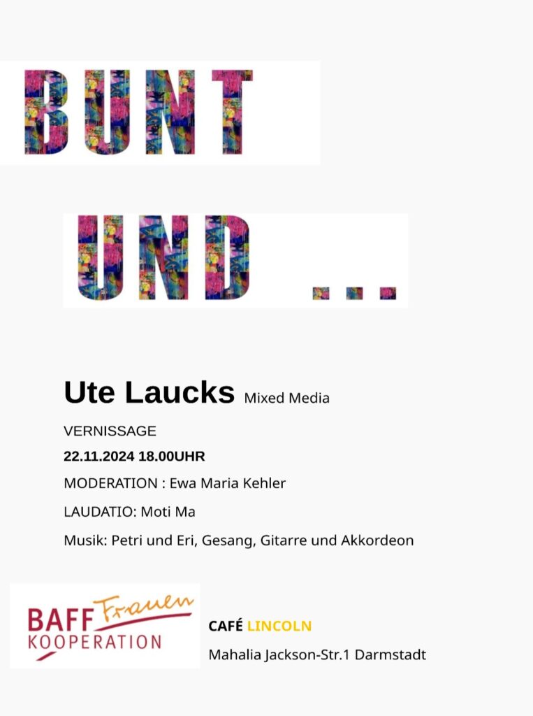 Am Freitagabend, dem 22.11.24, werden die Wände des Café Lincolns verziert: Die Künstlerin Ute Laucks eröffnet eine Vernissage ihrer Werke unter dem Motto „Bunt und …„.