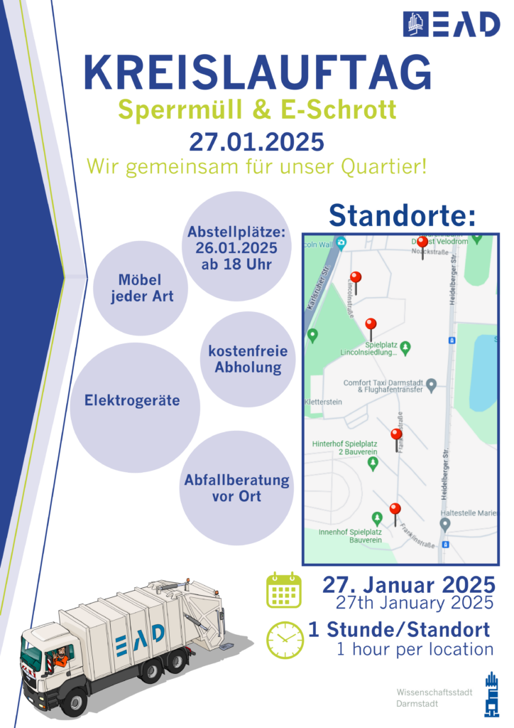 Der Termin ist ungünstig? Sperrmüll darf nicht einfach beim Hausmüll oder anderen Müllcontainern abgestellt werden! Anwohner*innen können einen separaten Termin zur Sperrmüllabholung kostenfrei beantragen über https://portal.ead.darmstadt.de/inchorus/garbage.html oder das EAD Servicetelefon 06151-13 45 000.