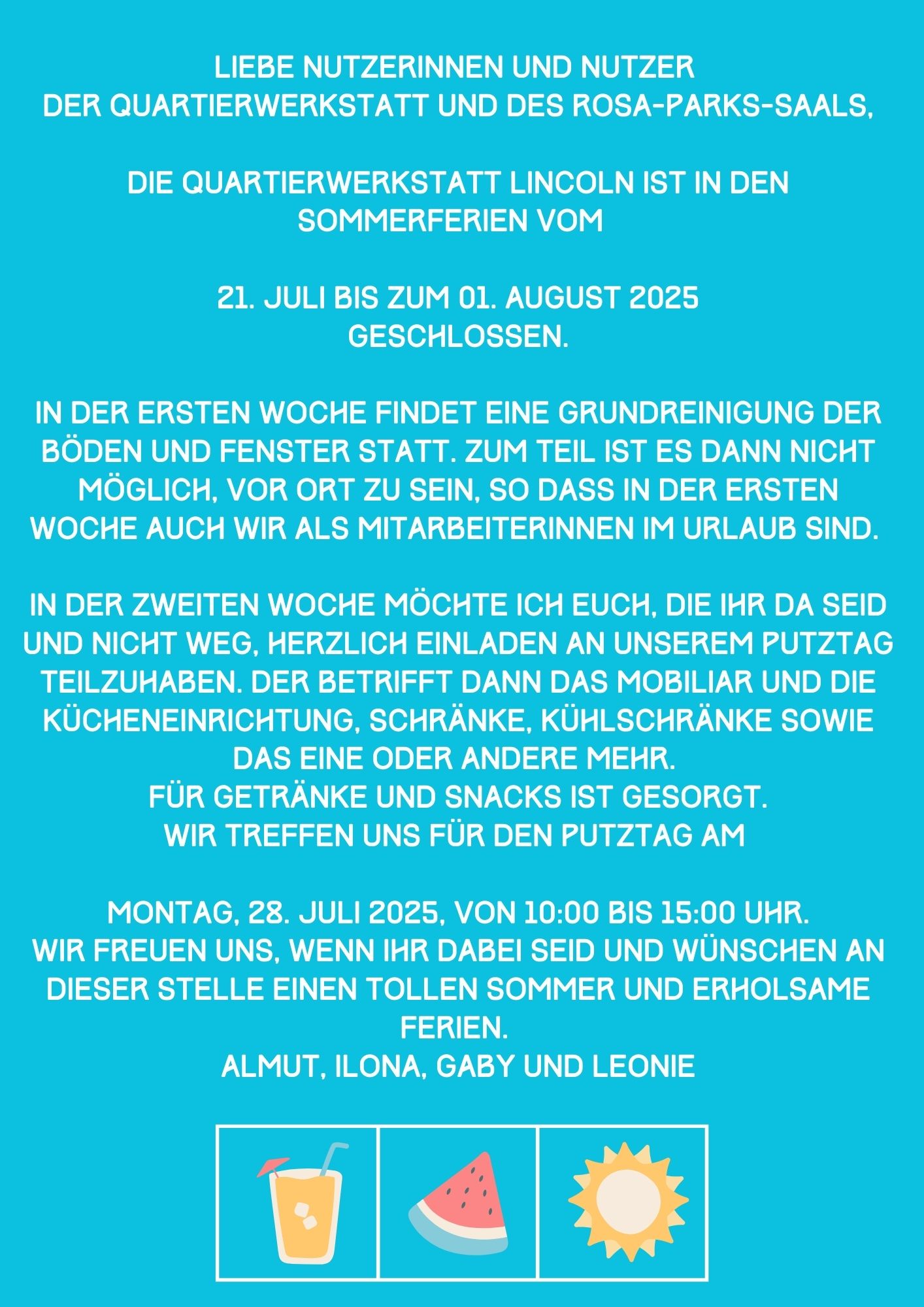 Vom 21. Juli bis zum 1. August bleibt die Quartierwerkstatt geschlossen. Es findet in der Zeit keine Beratung statt. Die Räume werden gereinigt und stehen weder Gruppen im Viertel noch für andere Veranstaltungen zur Verfügung.