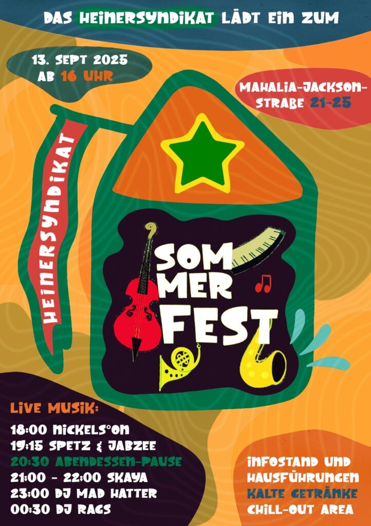 Die Bewohnerinnen und Bewohner vom Wohnprojekt Heinersyndikat laden herzlich ein zum Sommerfest – ein Tag mit Livemusik ab 18 Uhr, leckerem Essen, kühlen Getränken und spannenden Einblicken rund um´s Haus!