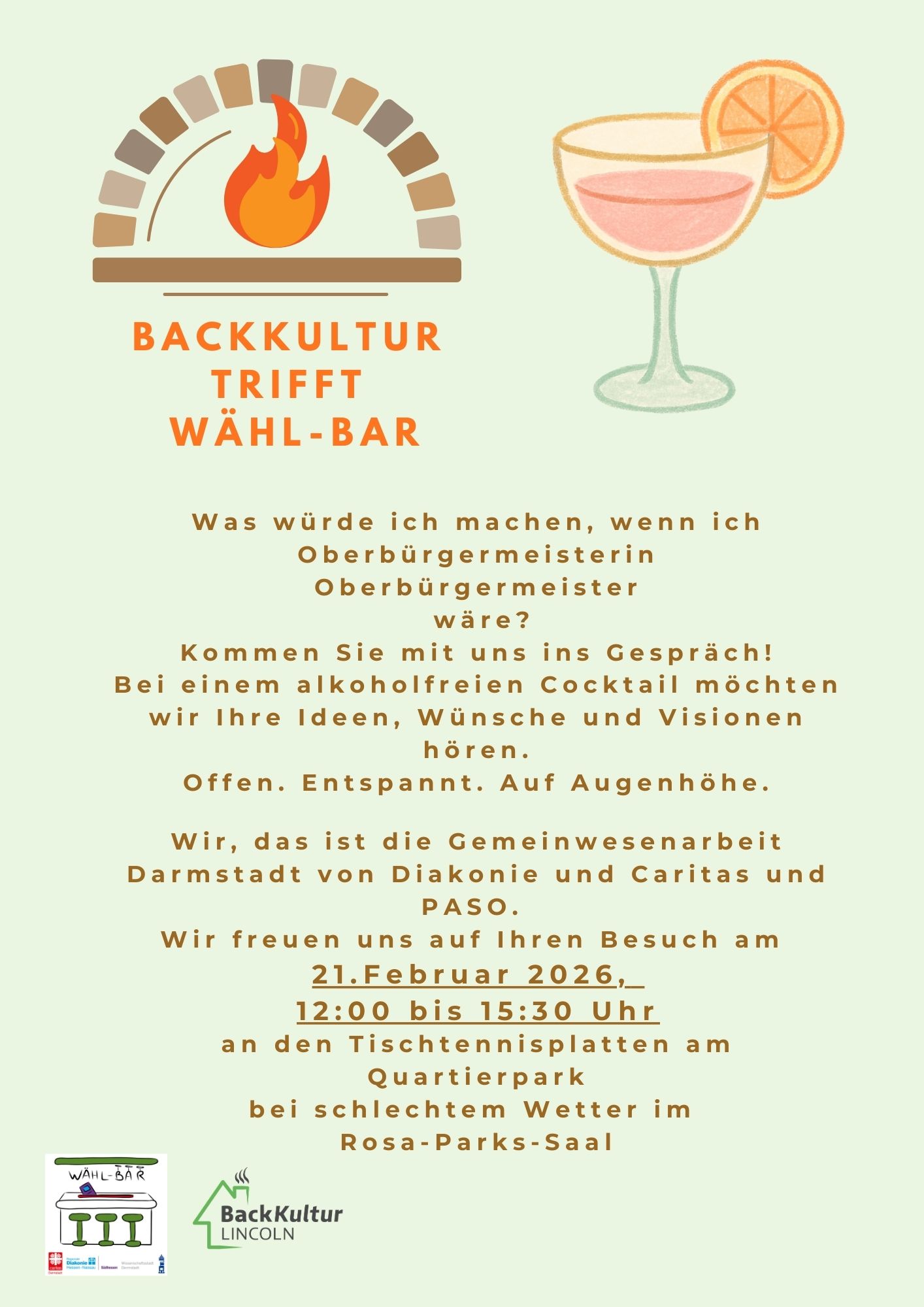 Die Gemeinwesenarbeit (Regionale Diakonie Südhessen, Caritas Verband Darmstadt) organisiert dazu eine Wähl-Bar, bei der man sich über die Kommunalwahlen im März informieren kann. Während Menschen mit deutscher Staatsbürgerschaft die Vertreterinnen und Vertreter der Stadtverordnetenversammlung wählen, finden für die ausländischen Einwohnerinnen und Einwohner zeitgleich die Wahlen des Ausländerbeirats statt. Bei alkoholfreien Cocktails kann man hier ins Gespräch kommen über die kommende Kommunalwahl, Wahlen insgesamt, Demokratie und alles, was es zu Politik noch zu sagen gibt.