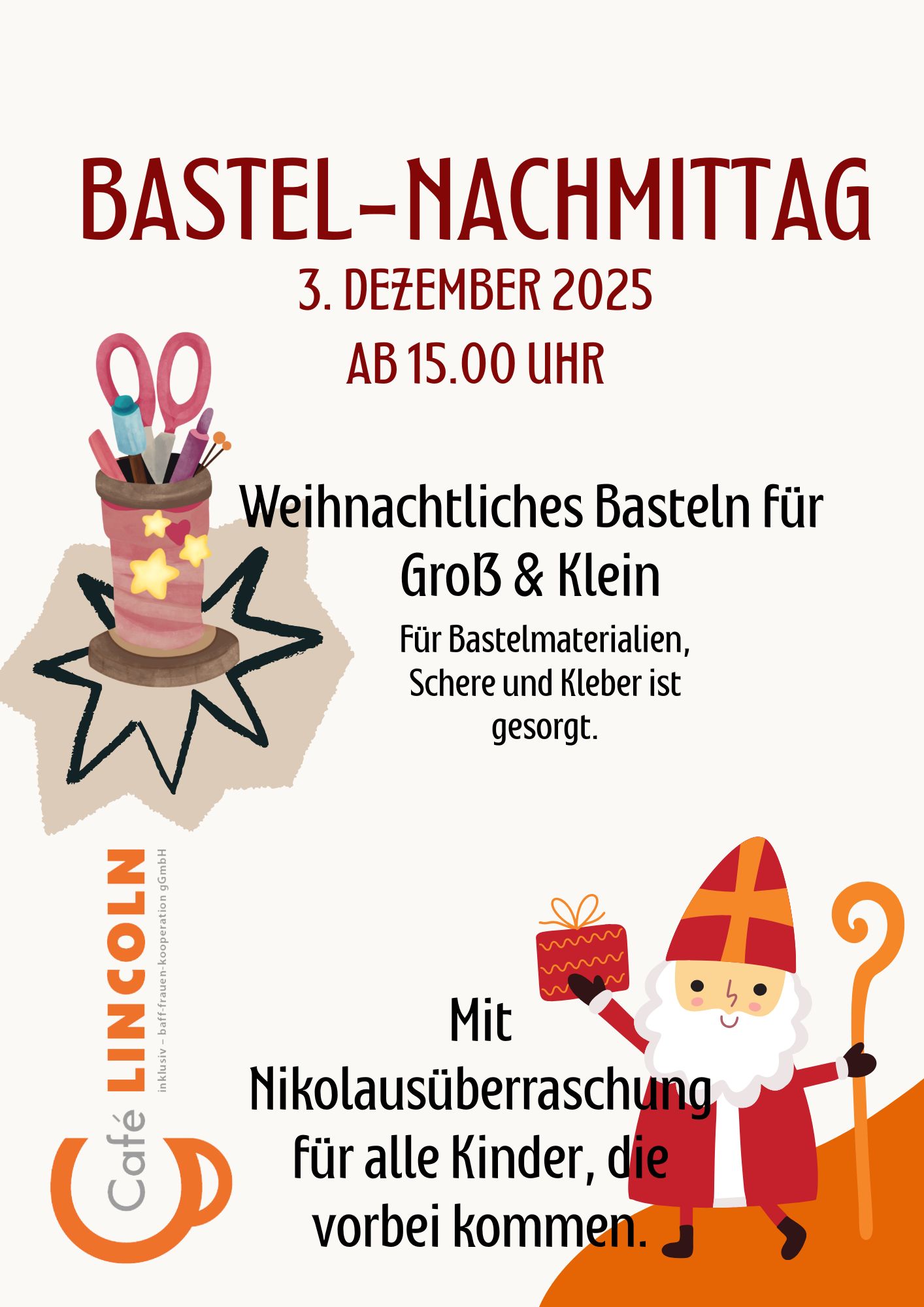 Das Team des Café Lincoln lädt Groß und Klein zu einem weihnachtlichen Bastelnachmittag ein. Bastelmaterialien sind vorhanden.