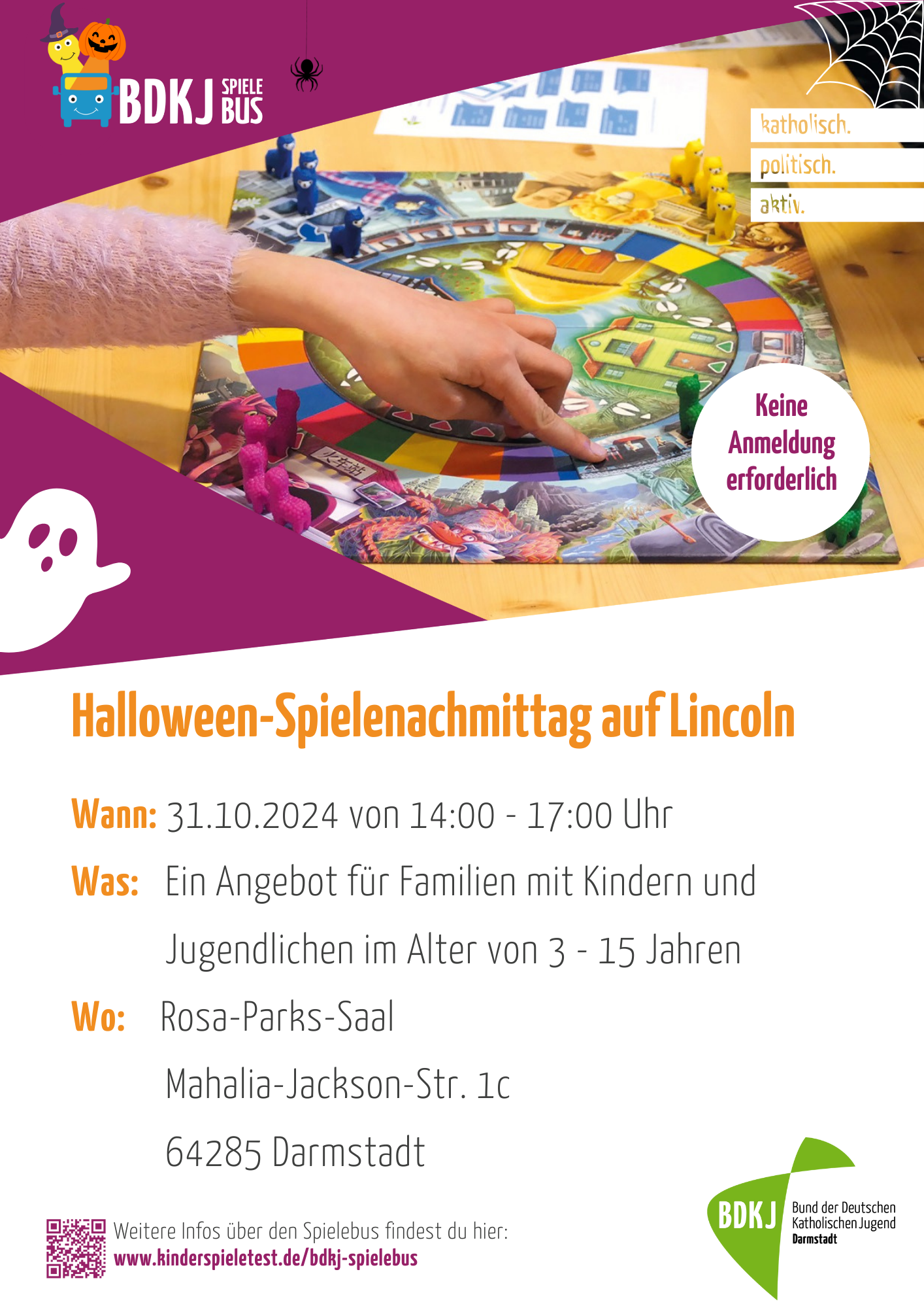 Zum letzten Mal dieses Jahr hält der Spielebus auf Lincoln und bietet einen Spielenachmittag an. Angeboten wird dieses Mal eine kleine Halloweenparty mit gruseligen Spielen, lustiger Musik und natürlich auch Süßem und Saurem. Gerne darf sich zu diesem Anlass verkleidet werden.