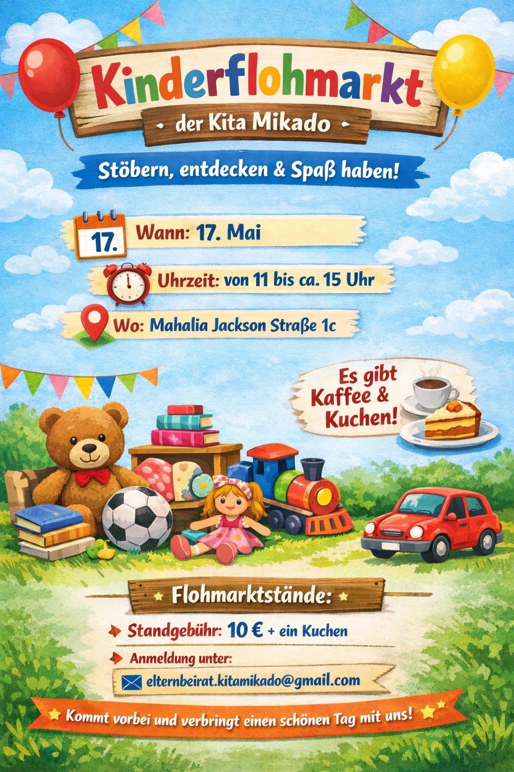 Die Kita Mikado lädt ein zum Kindersachenflohmarkt! Bei Kaffee und Kuchen gibt es die Gelegenheit zum Stöbern, Entdecken und Spaß haben. Die Standgebühr beträgt 10€ plus einen Kuchen. Bei Interesse bitte unter der E-Mail elternbeirat.kitamikado@gmail.com anmelden.