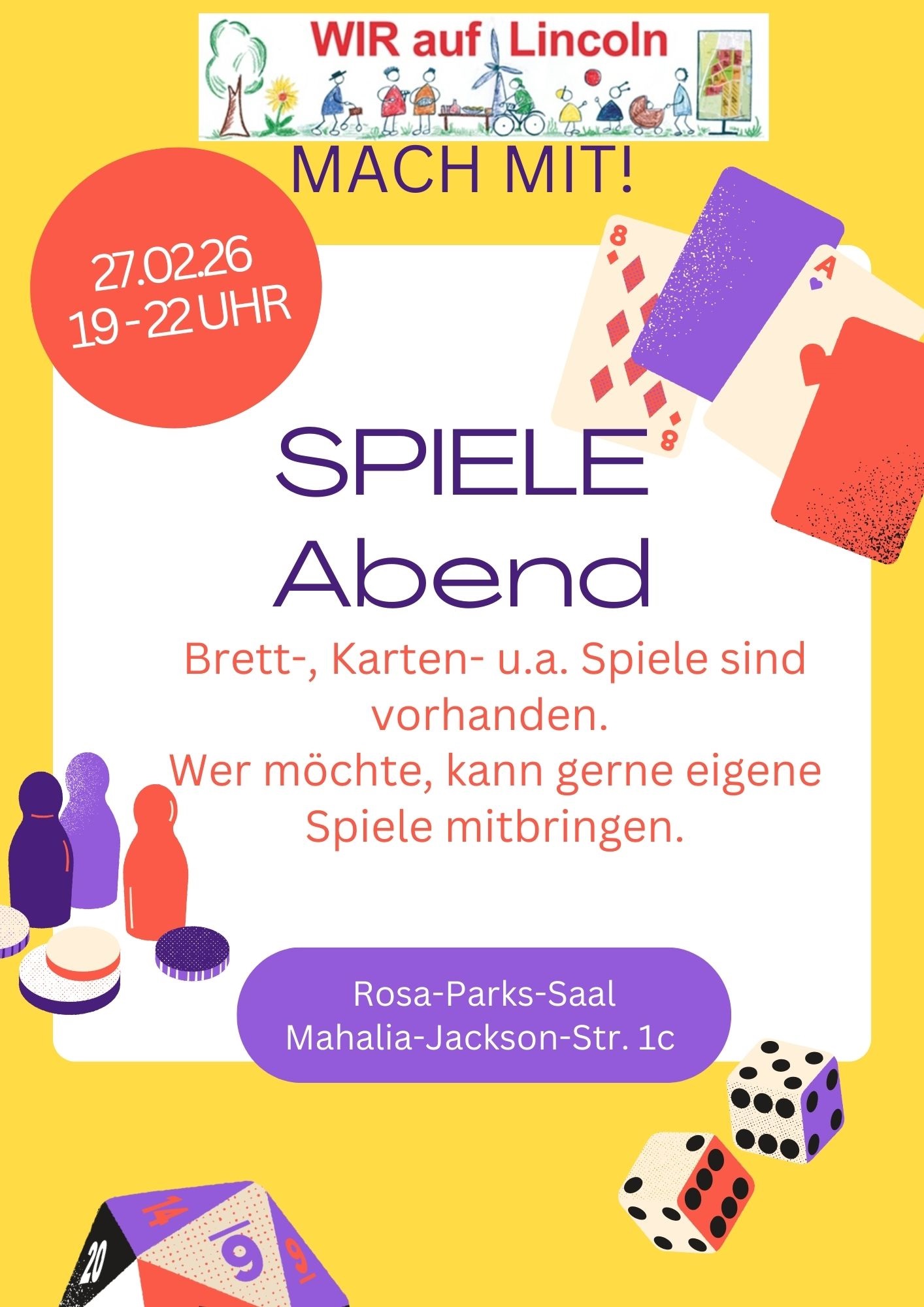 WIR auf Lincoln lädt ein zum gemütlichen Spieleabend. Einige Brett-, Karten- und Würfelspiele sind vorhanden, eigene Spiele können gerne mitgebracht werden. Wir freuen uns darauf, beim gemeinschaftlichen Spielen neue Spiele auszuprobieren und weitere Nachbarn kennenzulernen.