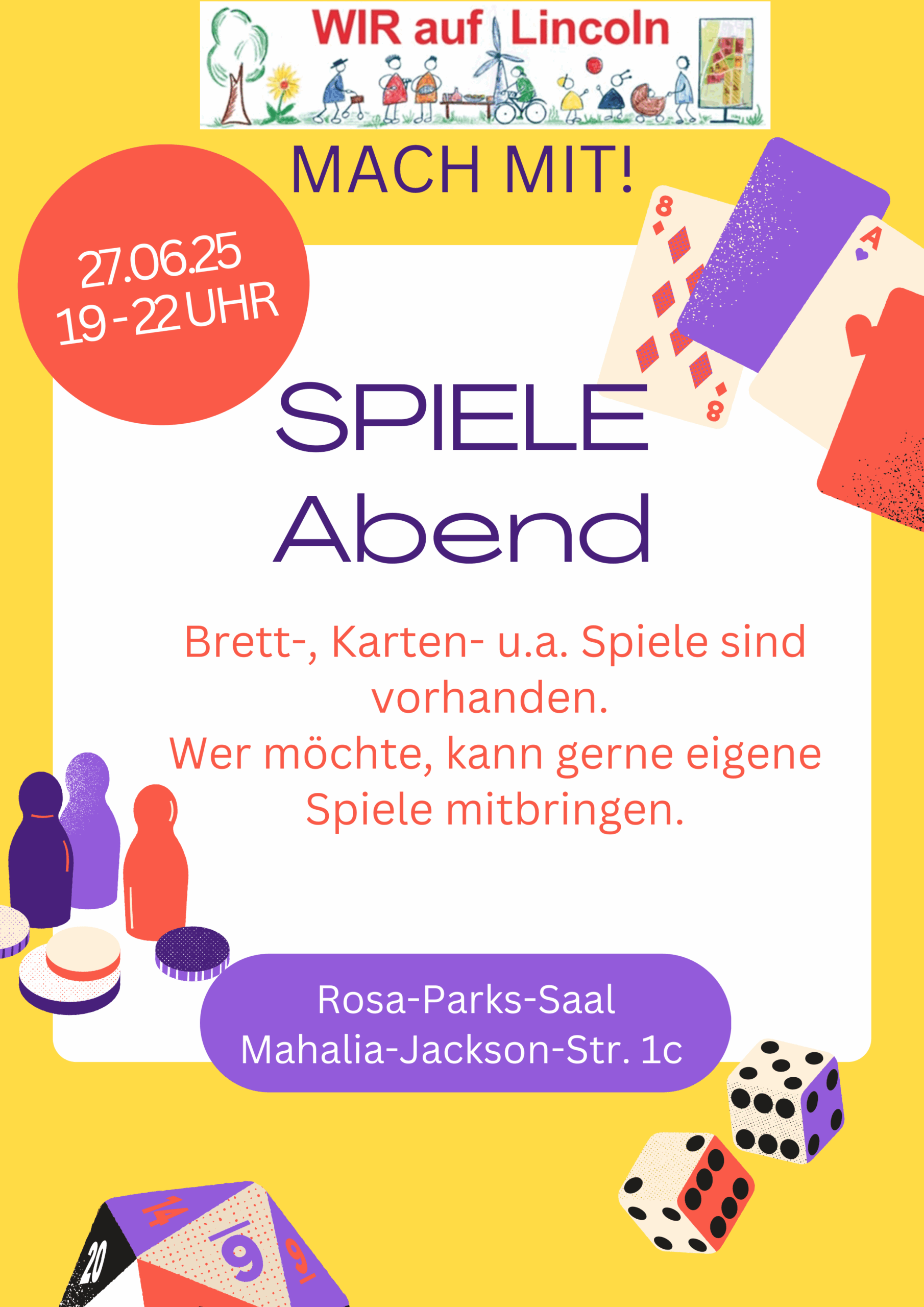 WIR auf Lincoln und das Quartiermanagement laden ein zum gemütlichen Spieleabend. Einige Brett-, Karten- und Würfelspiele sind vorhanden, eigene Spiele können gerne mitgebracht werden. Wir freuen uns darauf, beim gemeinschaftlichen Spielen neue Spiele auszuprobieren und weitere Nachbarn kennenzulernen.