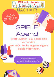 WIR auf Lincoln und das Quartiermanagement laden ein zum gemütlichen Spieleabend. Einige Brett-, Karten- und Würfelspiele sind vorhanden, eigene Spiele können gerne mitgebracht werden. Wir freuen uns darauf, beim gemeinschaftlichen Spielen neue Spiele auszuprobieren und weitere Nachbarn kennenzulernen.