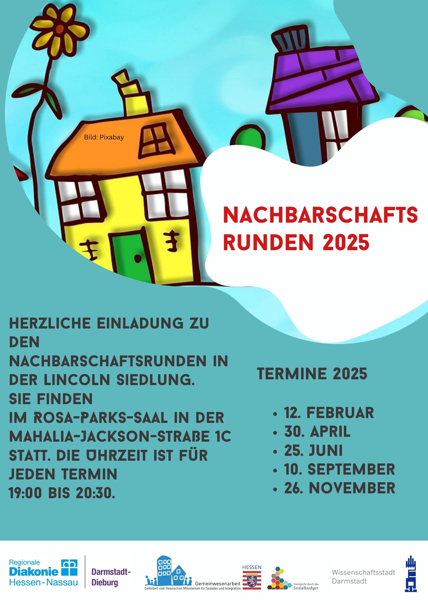 Alle Bewohner und Bewohnerinnen der Siedlung sind herzlich eingeladen zur Nachbarschaftsrunde. Bei diesem Treffen wird Aktuelles zur Lincoln-Siedlung vorgestellt und die Anliegen der Anwesenden besprochen.