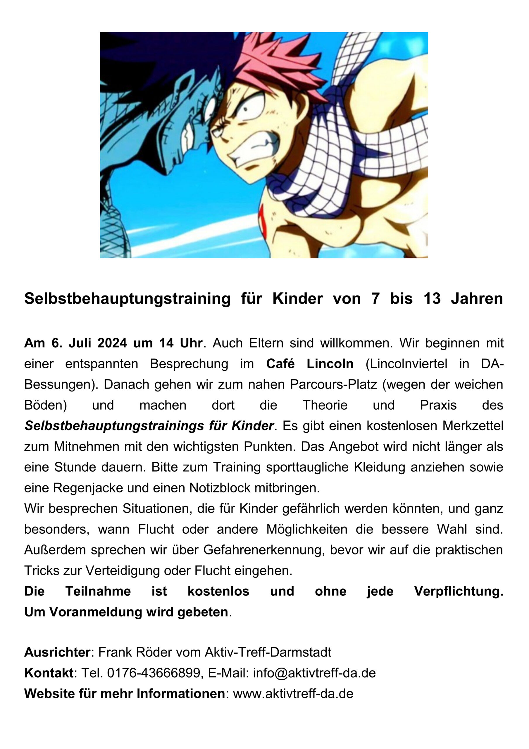 Der Aktiv-Treff-Darmstadt bietet ein Selbstbehauptungstraining für Kinder an. Wir besprechen Situationen, die für Kinder gefährlich werden können. Kinder lernen, wann Flucht oder andere Möglichkeiten die bessere Wahl sind und wie man Gefahren frühzeitig erkennt.