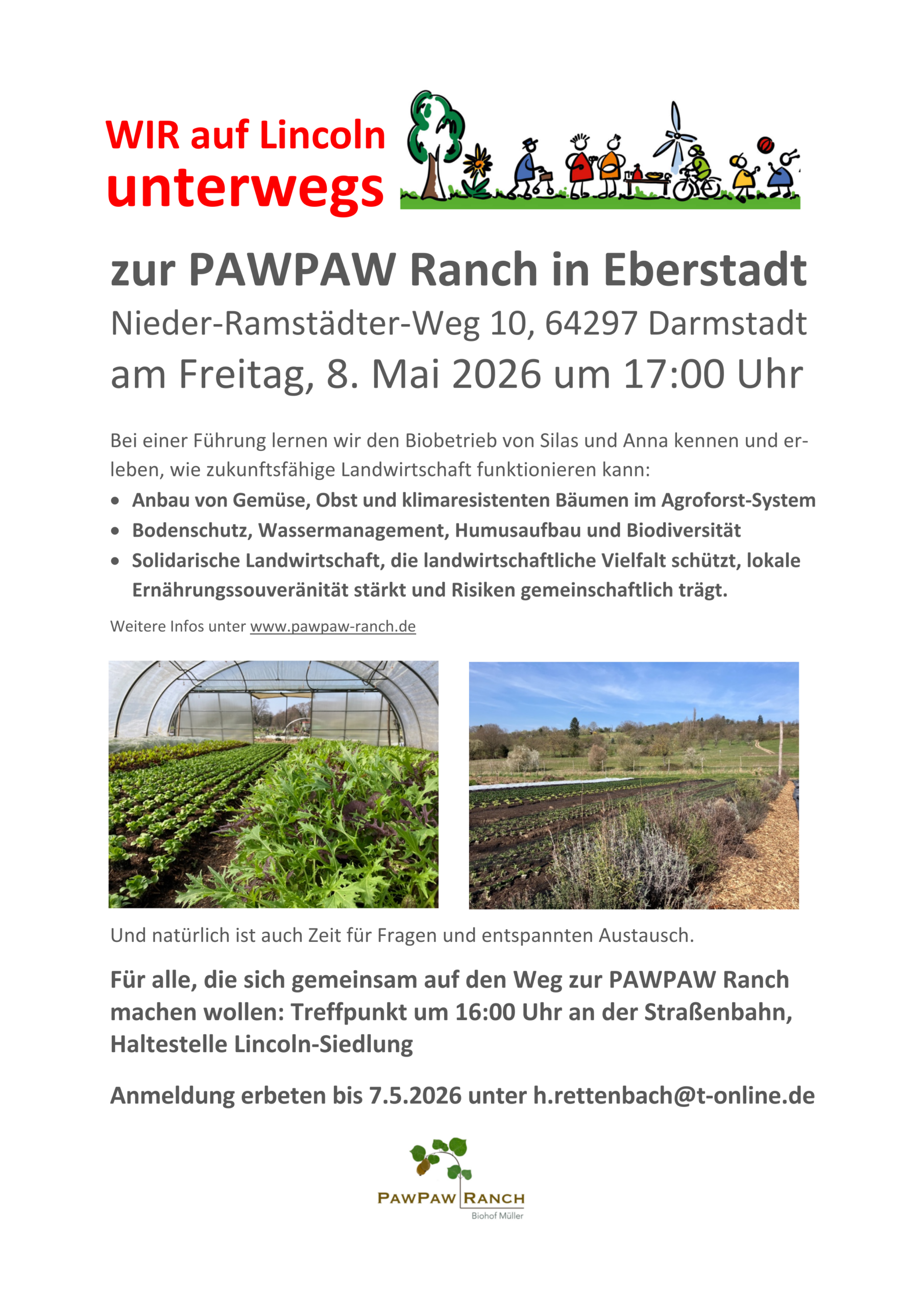 Für alle, die sich gemeinsam auf den Weg zur PAWPAW Ranch machen wollen: Treffpunkt um 16 Uhr an der Straßenbahn Haltestelle Lincoln-Siedlung.